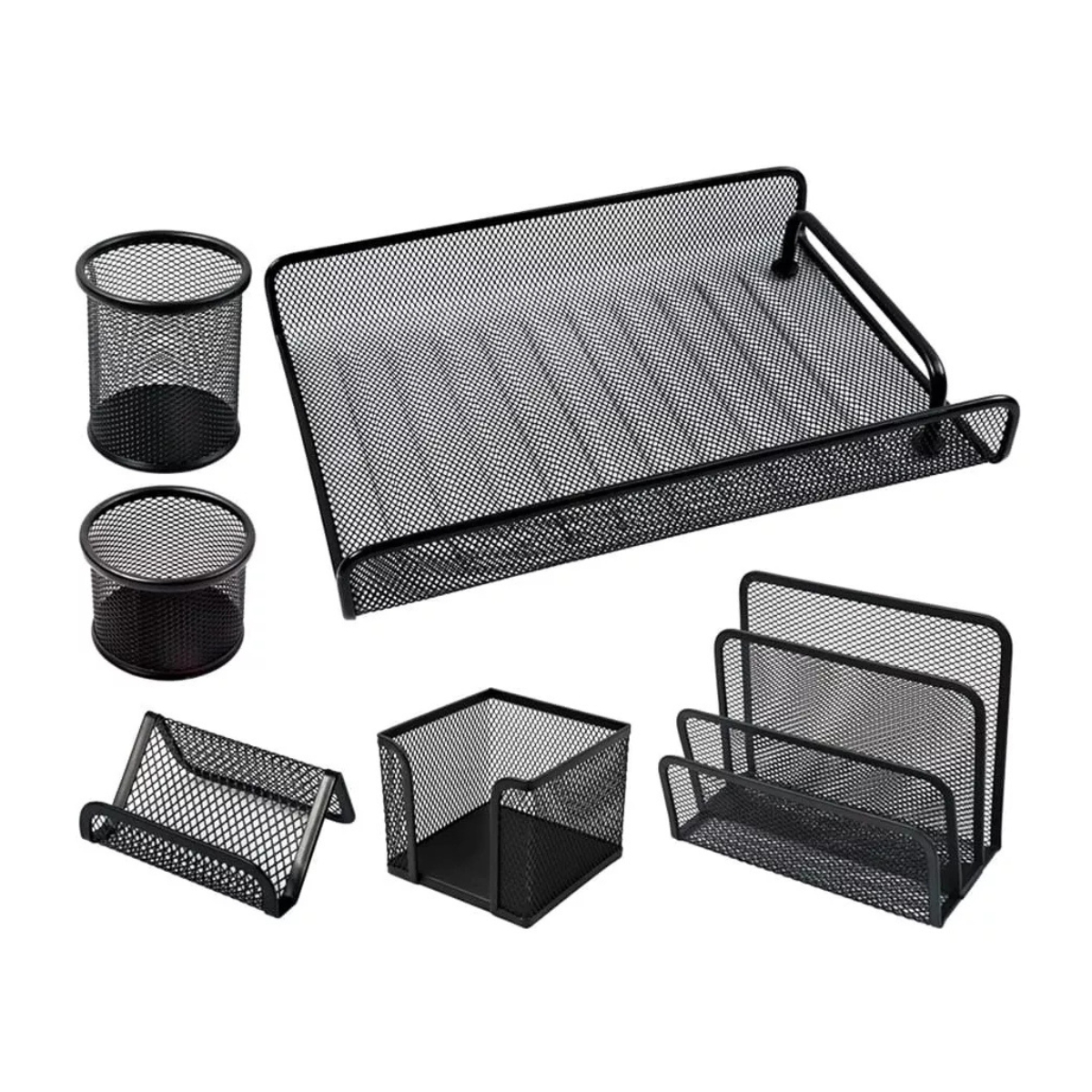 Set de Oficina x 6 piezas en malla metálica, ideal para organizar tu escritorio de forma funcional y moderna. Incluye organizadores para documentos, bolígrafos, clips y más. Mejora tu espacio con estilo y orden.