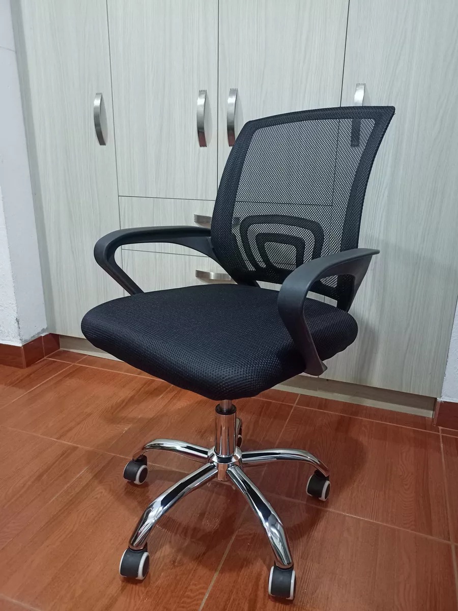 Silla Ergonómica para Oficina en color negro, con base cromada, apoya brazos, soporte lumbar y altura regulable. Ideal para quienes buscan comodidad, funcionalidad y un toque moderno y elegante en su espacio de trabajo.